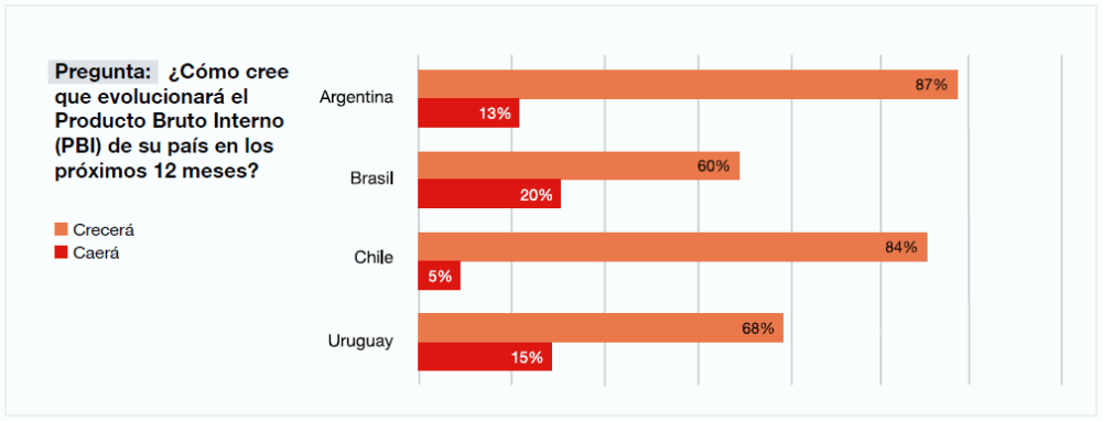 A diferencia de lo que ocurre en otros mercados, los CEO argentinos muestran una confianza superior al promedio regional y global respecto del desempeño de la economía local. El informe destaca que Argentina vuelve a liderar las expectativas de crecimiento en la región, incluso por encima de países como Brasil, Chile y Uruguay.