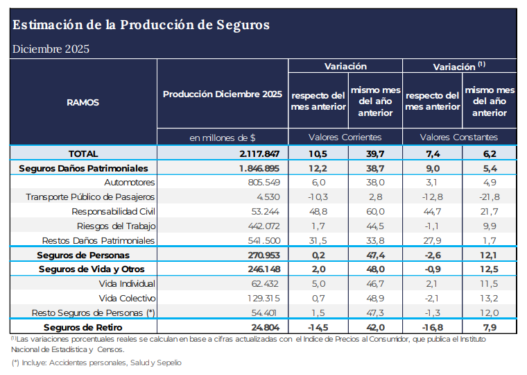 Según los datos oficiales correspondientes al último mes del año pasado, publicados recientemente por la Superintendencia de Seguros de la Nación (SSN), la producción neta mensual de la industria aseguradora fue de 2,117 billones de pesos, lo que implica un aumento del 7,4% mensual en términos reales con respecto al mes anterior, noviembre ($1,917 billones -ver nota-). Asimismo, se destaca un incremento del 6,2% versus diciembre de 2024.