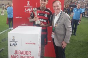 Antonio Huertas, Presidente de MAPFRE, entregó el galardón, que reconoce al futbolista con mejor desempeño defensivo. Dos leyendas del fútbol sudamericano...