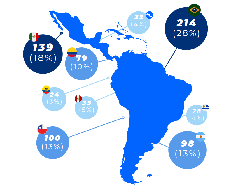 Si se desgrana el total de startups existentes en la región, Brasil (214), México (139), Chile (100) y Argentina (98) son los territorios con mayor número de agentes. Uruguay (+33%), Chile (+25%) y México (+16%) son los países en los que se ha dado un mayor crecimiento de estas compañías.
