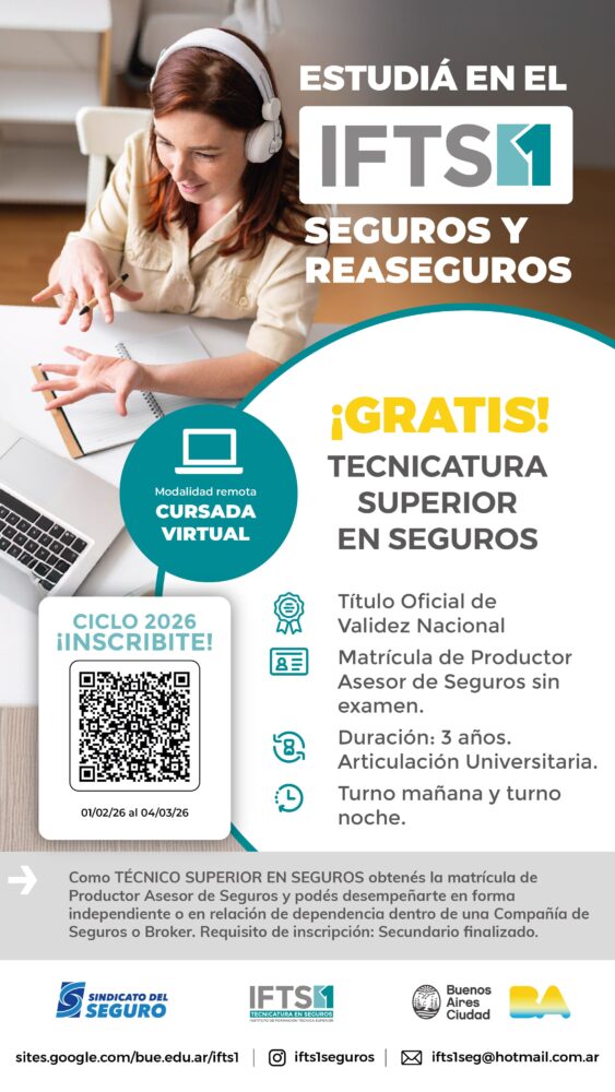 Desde el Instituto de Formación Técnica en Seguros (IFTS N° 1) informan que el próximo 4 de marzo cierra la inscripción al primer tramo del ciclo lectivo 2026 de la carrera gratuita de Técnico Superior en Seguros, con título oficial de alcance nacional.