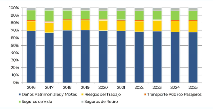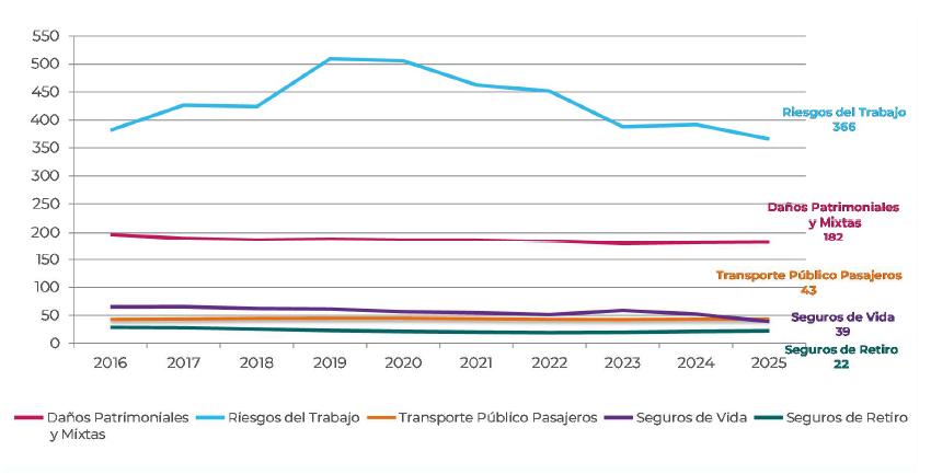 En cuanto a la distribución por Actividad Principal para el Ejercicio Económico 2025, registra 120 operadores de seguros de Daños Patrimoniales y Mixtos, 15 de Riesgos del Trabajo, 5 de Transporte Público de Pasajeros, 34 de Seguros de Vida y 15 de Seguros de Retiro.