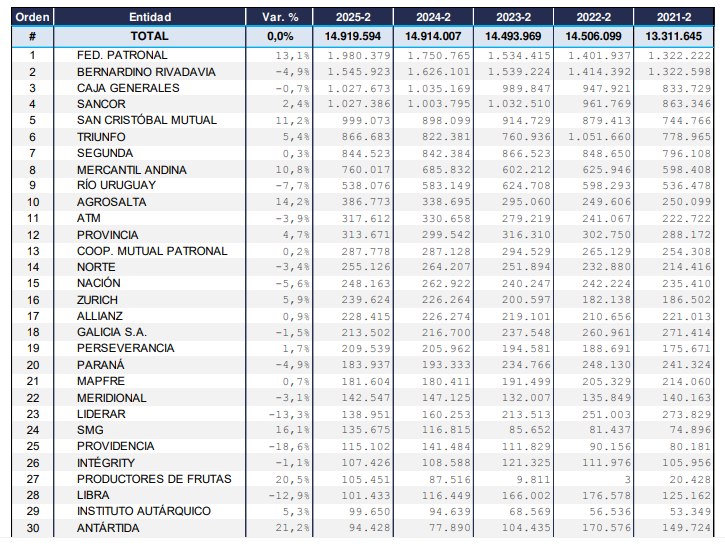 Dentro del top 30, las aseguradoras que más crecieron porcentualmente versus el mismo trimestre del año anterior fueron Antártida (+21,2%), Prof Seguros (+20,5%), SMG (+16,1%) y Agrosalta (+14,2%); en tanto que las que más perdieron fueron Providencia (-18,6%), Liderar (-13,3%) y Libra (-12,9%).