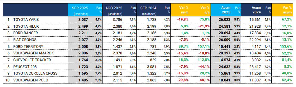 Por otro lado, en la siguiente tabla se exhibe el top 10 con los modelos más vendidos en el segmento de automóviles livianos en septiembre, que continúa liderando el Toyota Yaris (el más vendido, superando las 3.000 unidades, alcanzando el 5,7% del total), seguido por la Toyota Hilux (que continúa en el segundo puesto, con casi 2.500 unidades vendidas, el 4,7% del total) y la Ford Ranger (que volvió a meterse en el podio, con más de 2.200 unidades vendidas, el 4,2% del total). El Fiat Cronos se ubicó en el cuarto lugar; mientras que la sorpresa del mes la dio el Ford Territory, que apareció en la quinta posición.