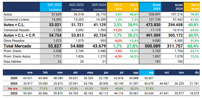 “Septiembre crece con respecto a agosto, pero sobre todo mantiene un crecimiento interanual por encima del 27% y continúa esta positiva tendencia de incremento interanual que nos acompaña desde enero. Se percibe ahora un escenario de mayor estabilidad en la macro, con lo cual esperamos seguir creciendo en las próximas semanas”, concluyó Beato, quien confía en las proyecciones de un mercado total anual por encima de las 600 mil unidades al finalizar el año.