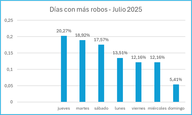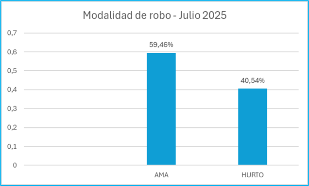 En lo que respecta a las modalidades, el hurto mostró un aumento del 54% en comparación a julio de 2024. Sin embargo, el robo a mano armada prevaleció con el 59,46% de los casos, y la vía pública fue el principal escenario del delito con el 95,45%.