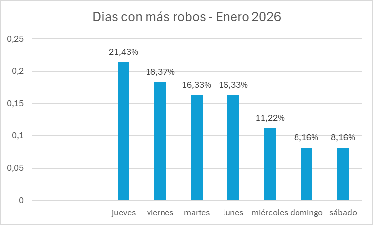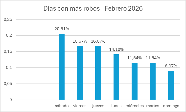 Respecto a los días de la semana, el comportamiento de los robos muestra variaciones entre ambos meses, aunque con cierta concentración hacia el final de la semana. En enero, los jueves se posicionaron como el día más crítico, concentrando el 21,43% de los casos, seguidos por los viernes (18,37%). Sin embargo, en febrero el pico se trasladó al sábado, que pasó a liderar con el 20,51%, mientras que jueves y viernes compartieron el segundo lugar con el 16,67%.