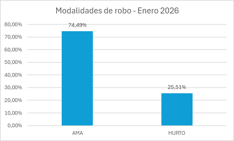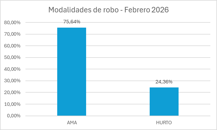 Durante el verano, la modalidad a mano armada fue la más utilizada por los delincuentes: representó el 74,49% de los casos registrados en enero y el 75,64% en febrero. El hurto sostuvo porcentajes similares durante ambos meses alcanzando el 25,51%, y 24,36% respectivamente.