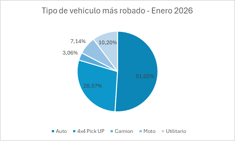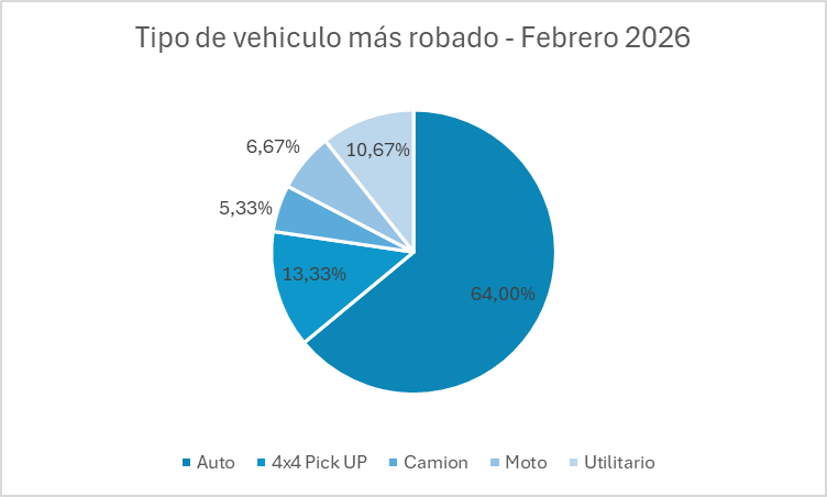 Según muestra el informe, los autos particulares siguen siendo el tipo de vehículo más buscado con el 57,5% de los casos totales y un aumento del 25,5% de enero a febrero. Las 4×4 Pick UP mantuvieron una alta participación durante el primer mes con el 28,57% y reflejaron una baja en el segundo mes del año alcanzando el 13,33%. Más atrás se ubicaron las motos (7,14% y 6,67%), los utilitarios (10,20% y 10,67%) y los camiones, que representaron el 3,06% en el primer mes y el 5,33% en el segundo.