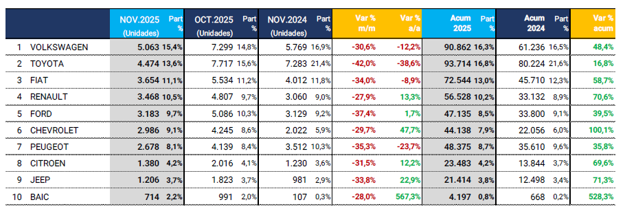 En el siguiente cuadro se puede observar el top 10 con las marcas más vendidas en el segmento de automóviles livianos en noviembre. El #1 de marcas es ocupado por Volkswagen, con el 15,4% del mercado, por encima de las 5.000 unidades vendidas; que luego de varios meses destrona a Toyota, relegándola en segundo lugar, con el 13,6% del mercado y cerca de 4.500 unidades vendidas. Fiat conserva el tercer puesto, con el 11,1% del mercado, superando las 3.600 unidades vendidas.
