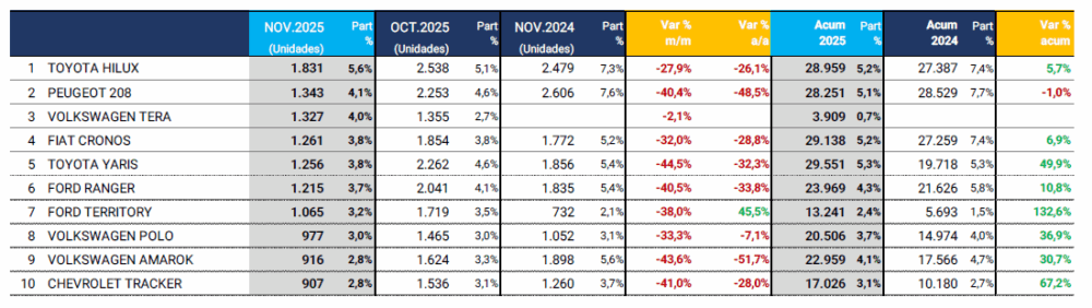 Por otro lado, en la siguiente tabla se exhibe el top 10 con los modelos más vendidos en el segmento de automóviles livianos en noviembre. Lo lidera la Toyota Hilux, que mantiene la primera posición del ranking, superando las 1.800 unidades, alcanzando el 5,6% del total. El Peugeot 208 pasa del tercer al segundo puesto, con más de 1.300 unidades vendidas, el 4,1% del total. El Volkswagen Tera se mete en el podio, también por encima de las 1.300 unidades vendidas y el 4,0% del total. El Fiat Cronos pasa del quinto al cuarto lugar, con más de 1.200 ventas; al igual que el Toyota Yaris, que baja de la segunda a la quinta posición; y la Ford Ranger, que pasa del #4 al #6.
