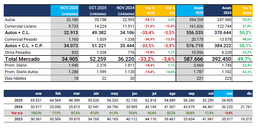 De acuerdo con lo publicado por la Asociación de Concesionarios de Automotores de la República Argentina (ACARA), durante noviembre de 2025 (hasta el viernes 28/11, último día hábil del mes) se patentaron 34.905 vehículos, lo que representa un 33,2% menos que en octubre (52.259 unidades) y un 3,6% menos que en noviembre de 2024 (36.220 unidades).