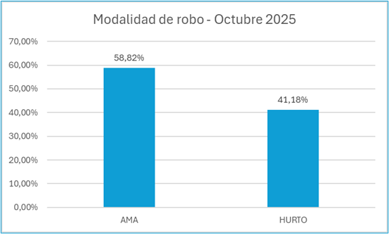 En este último reporte, correspondiente al mes de octubre de 2025, la modalidad de robo a mano armada prevaleció sobre el hurto, con un 58,82%. Sin embargo, esta última registró un aumento del 19% en comparación con el mes de septiembre.