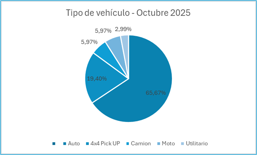 En octubre, los autos particulares volvieron a ser los vehículos más robados, con el 65,67% de los casos. En segundo lugar, se ubicaron las 4×4 pick up, con un 19,40% de participación. Luego se posicionaron los camiones y las motos, con un 5,97% cada uno; por último, los vehículos utilitarios representaron el 2,99% del total de incidentes reportados.