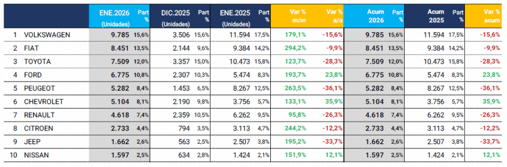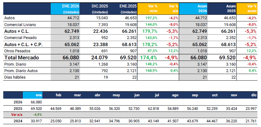 Durante el mes de enero de 2026 se patentaron 66.080 vehículos y así quedó posicionado como el tercer mejor mes de la última década, por debajo de los eneros de 2018 (un récord histórico, con casi 119 patentamientos) y 2025 (con 69.520 unidades patentadas, el segundo mejor mes).