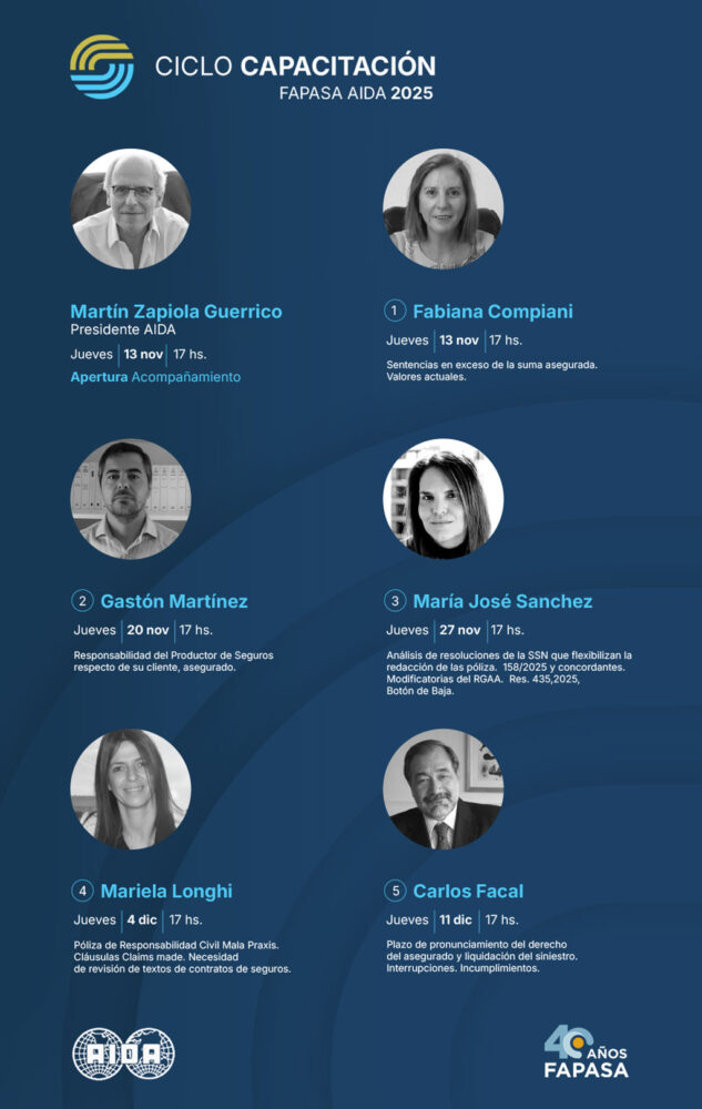 FAPASA, junto con AIDA Argentina, presenta una nueva edición del Ciclo de Capacitación 2025, un espacio de actualización que reúne a destacados expertos del ámbito jurídico y asegurador. A lo largo de cinco encuentros virtuales, se analizarán los principales desafíos legales y técnicos que enfrenta hoy la actividad, en un contexto de constante cambio regulatorio y profesional.