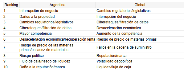 En línea con lo que sucede a nivel local, la interrupción de la actividad empresarial sigue siendo el principal riesgo para las organizaciones regionales debido a la exposición de crisis geopolíticas, eventos climáticos extremos, su dependencia de las rutas comerciales globales y la vulnerabilidad de la infraestructura local.