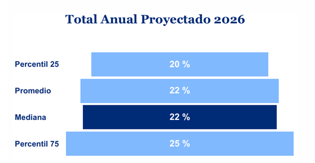 De acuerdo con los resultados del estudio, la mediana del presupuesto anual de incrementos salariales proyectados para 2026 se ubica en 22% en mediana de mercado, en línea con la inflación estimada por las compañías para el mismo período, que también se sitúa en torno al 22%, mientras que las proyecciones privadas relevadas por Mercer la ubican en 20,6%.