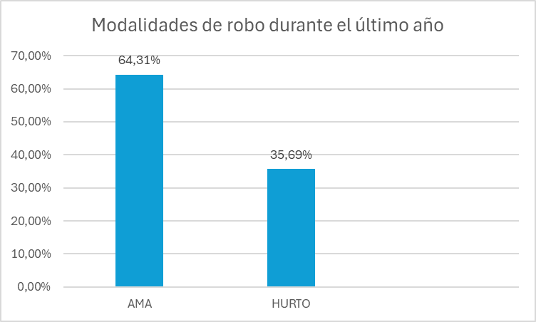 En cuanto a las modalidades, los robos a mano armada lideraron con un 64,31%, siendo enero de 2025 el mes que obtuvo el pico con el 74,49%, mientras que los hurtos representaron el 35,69%, un aumento del 23% con respecto al último indicador anual, emitido en diciembre 2024. En esta misma línea, el 94,19% de los robos a mano armada ocurrieron en la vía pública, mientras que, a lo largo del año, el robo a partir de esta modalidad en garage no superó nunca el 12%.