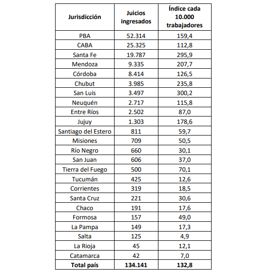 Además, el 73% de la litigiosidad se concentra en tres provincias: PBA, CABA y Santa Fe, generando una profunda afectación de la competitividad laboral dentro del país.