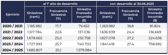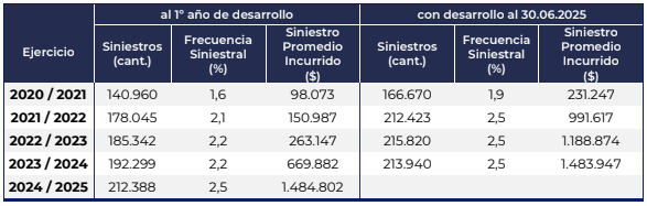 En las coberturas de Casco, el siniestro promedio se ubicó en $1.579.984, duplicando los valores del ejercicio anterior. La frecuencia siniestral del 25,1% se mantuvo estable, confirmando que el problema no es la cantidad de reclamos, sino su mayor costo.