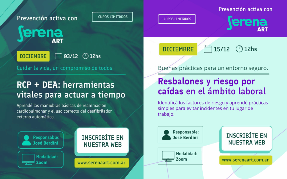 La primera charla será el 03/12 sobre RCP + DEA y la segunda, el día 15/12 con la temática de resbalones y caídas en el ámbito laboral.